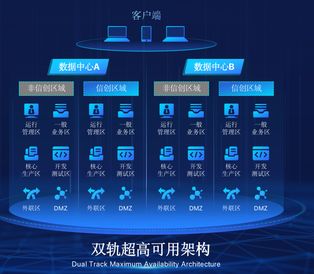leyu.乐鱼在企业面临自主创新IT基础重构过程中,推出的全新架构双轨超高可用架构(简称DTMAA),在双活数据中心的分区调度基础上,添加每个数据中心内信创域和非信创域的分域调度,来实现分区分域协同的多活双轨超高可用。