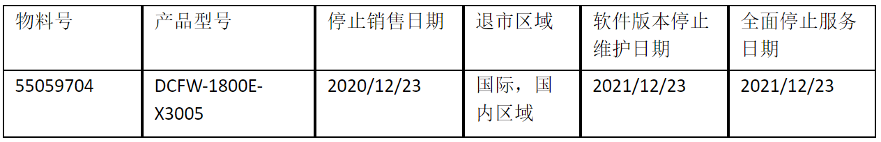 北京神州数码银河集团(galaxy)信息技术有限公司正式通知您, 以上DCFW-1800E-X3005下一代防火墙(55059704)将于2020年12月23号停止接收新的订单(具体日期见上表),不再供货。给您带来的不便,敬请原谅。