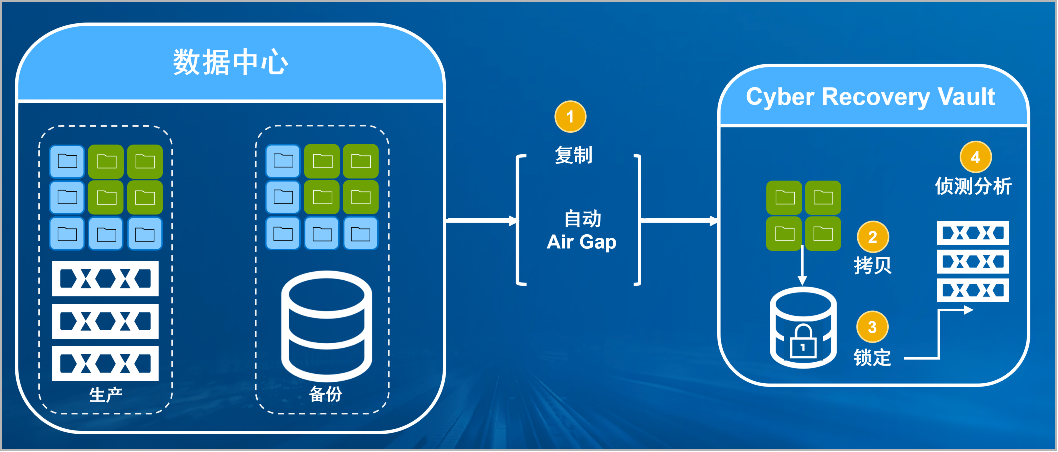 银河集团(galaxy)防勒索病毒方案将生产中心备份数据复制到Vault区,复制后网络自动断开实现弹性隔离。Vault区的数据快速拷贝,并对拷贝版本加锁(在锁定期数据不允许删除和修改)。Vault沙箱内对拷贝版本进行扫描分析,验证数据是否完好。